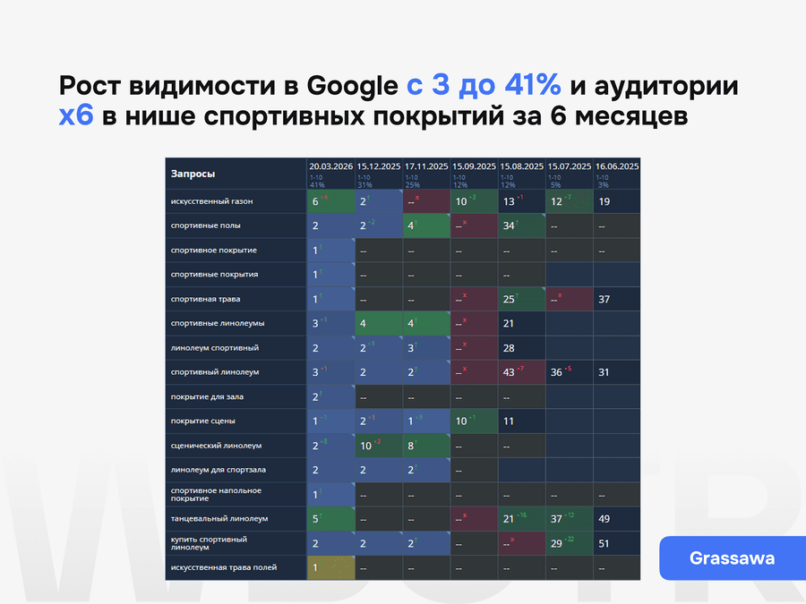 Отслеживаем позиции, трафик, поведение и вовлечённость. Корректируем стратегию, усиливаем релевантные страницы, устраняем тормозящие факторы.